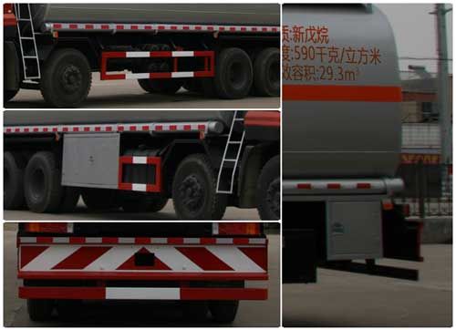 | 整車說明: | 罐體有效容積:29.3立方米,介質(zhì):新戊烷,類項號:3,密度:590千克/立方米,罐體尺寸:長9000毫米,長軸2450毫米,短軸1690毫米.隨底盤選裝駕駛室,選裝罐頂護欄和尾部爬梯.側(cè)、后防護裝置材料材質(zhì):Q235B,側(cè)、后防護均用螺栓連接,后部防護裝置斷面尺寸(寬×高)60×100(mm),后部防護離地高度:540mm.安裝具有衛(wèi)星定位功能的行駛記錄儀,安裝前輪盤式制動器,僅采用底盤子午線輪胎.ABS生產(chǎn)廠家:東風(fēng)電子科技股份有限公司制動系統(tǒng)公司;型號:3631010-C2000 | ||
